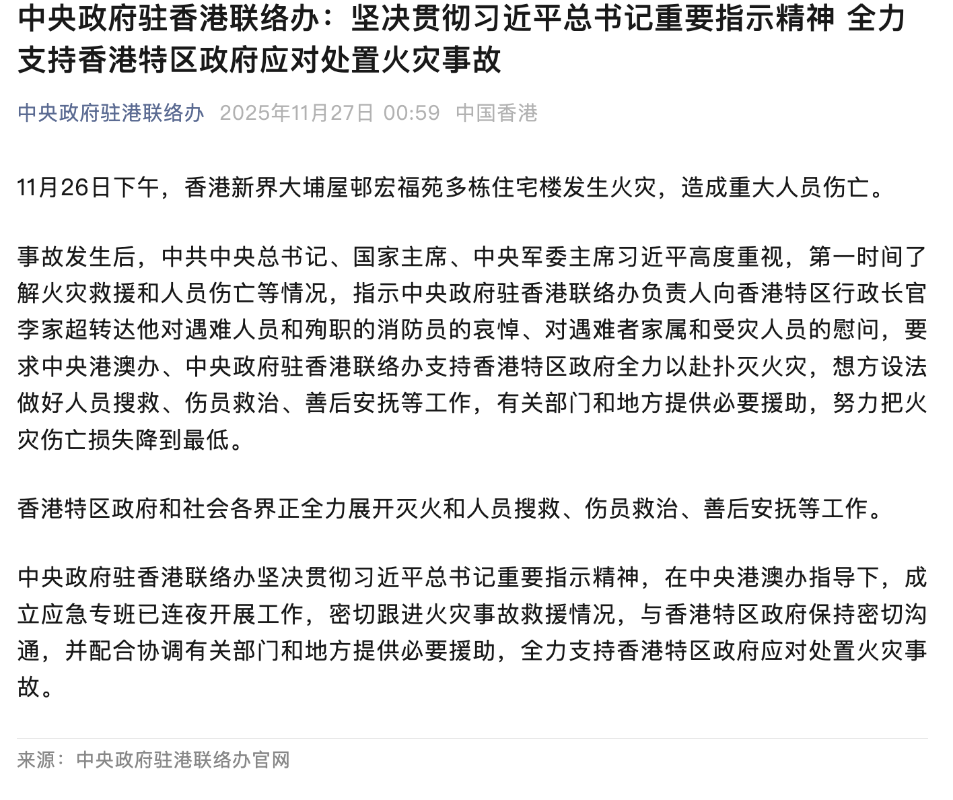 中央政府驻香港联络办坚决贯彻习近平总书记重要指示精神,在中央港澳办指导下,成立应急专班已连夜持续开展工作,密切跟进火灾事故救援情况,与香港特区政府保持密切沟通,并配合协调有关部门和地方提供必要援助,全力支持香港特区政府应对处置火灾事故。(完)