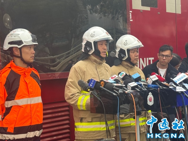 香港大埔宏福苑五级火,至11月27日当天下午造成55人死亡。图为消防处助理救护总长林卓豪(左起)、消防处副处长黄嘉荣在现场介绍最新进展。 香港中通社图片