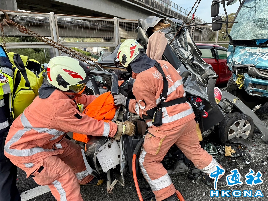 11月27日,台湾第三高速公路北上新竹系统路段,发生一起严重的7车连环追撞事故。1辆大货车司机疑似恍神,未注意前方塞车回堵状况,猛力追撞前方6辆小客车,其中1辆小客车被撞致严重变形,司机一度受困。整起事故共造成6名男性轻重伤者送医。香港中通社图片