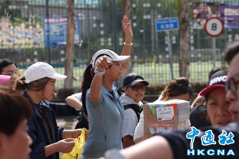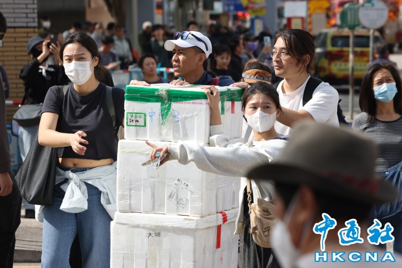 11月27日,香港大埔宏福苑五级大火后,社区力量迅速集结。志愿者们推著堆满矿泉水的购物车穿梭现场,泡沫箱上“长沙湾”字样见证跨区援助。(香港中通社记者 邓梓杰 摄) 香港中通社图片