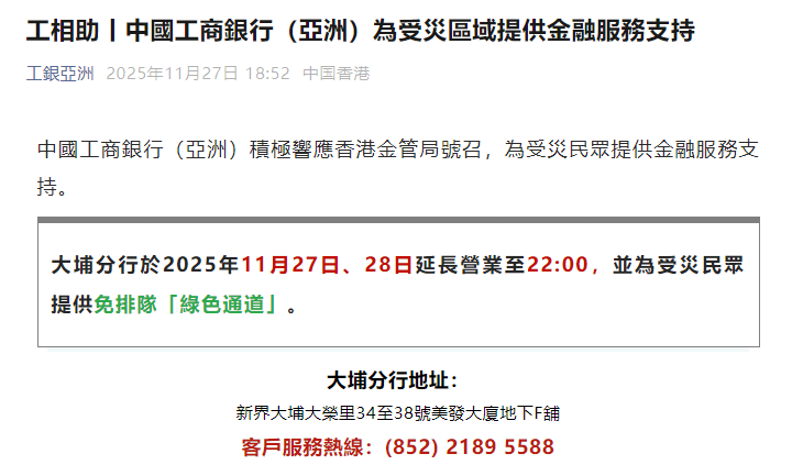 中国工商银行(亚洲)积极响应香港金管局号召,为受灾民众提供金融服务支持。中国工商银行(亚洲)表示,大埔分行27日、28日的营业时间将延长至晚上10时,并设置免排队“绿色通道”。该行在大埔附近分行及周边ATM机准备充足现金,均可提供无卡取款服务。