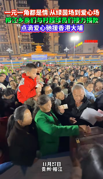 据榕江县红十字会工作人员透露,此前香港明星足球队曾到“村超”踢球,榕江县在今年6月遭受特大洪灾时也获得香港同胞的爱心捐赠,香港火灾发生后,不少群众自发找到他们想为香港献出爱心。应父老乡亲的请求,榕江县红十字会于27日晚在“村超”球场为香港大埔火灾受灾人员募捐。