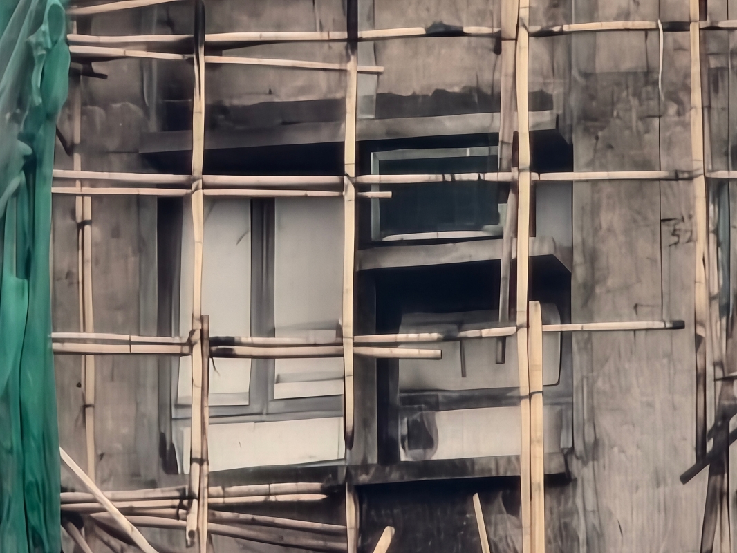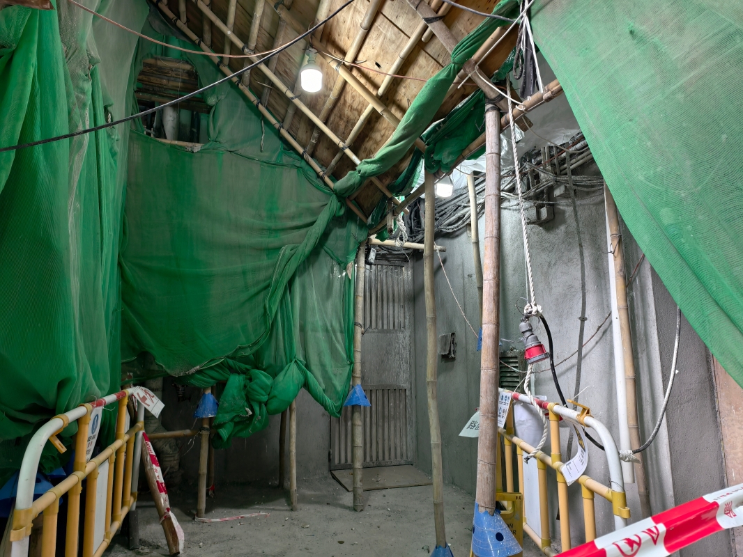 记者28日到位于离宏福苑约半小时车程、正进行大维修的穗禾苑。与发生火灾的宏福苑一样,在香港不少有“苑”的都是居屋,市民在政府资助下可以用低至六折价格购入,但卖出时则需要补地价,防止炒卖,因此这些居屋都是市民购入长期居住的。根据政府要求,超过30年的住宅需要在官方验证后进行需要的外墙维修工程,业主动辄需要分摊十几万的费用。穗禾苑依山而建,共9栋,目前除一栋正在进行棚架拆除作业外,其余大厦均整栋被包著绿网的棚架包围。而在大厦的楼梯间和走廊,也堆满了竹棚和绿色围网。