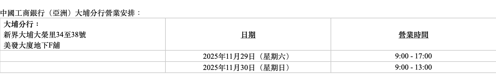 分行服务方面,中国工商银行(亚洲)进一步延长大埔分行于本周末的营业时间,以满足受大埔火警影响的市民在银行服务方面的急切需求。三间分行均提供储备瓶装水、插电与充电装置及休息空间,更特别为受影响市民设有专用热线(852)3510 1282处理紧急金融业务。此外,为配合应急援助金发放安排,进一步加大相关分行的现金库存,以及确保大埔区与邻近区域的自动柜员机现金供应充足,方便受影响市民提取现金。