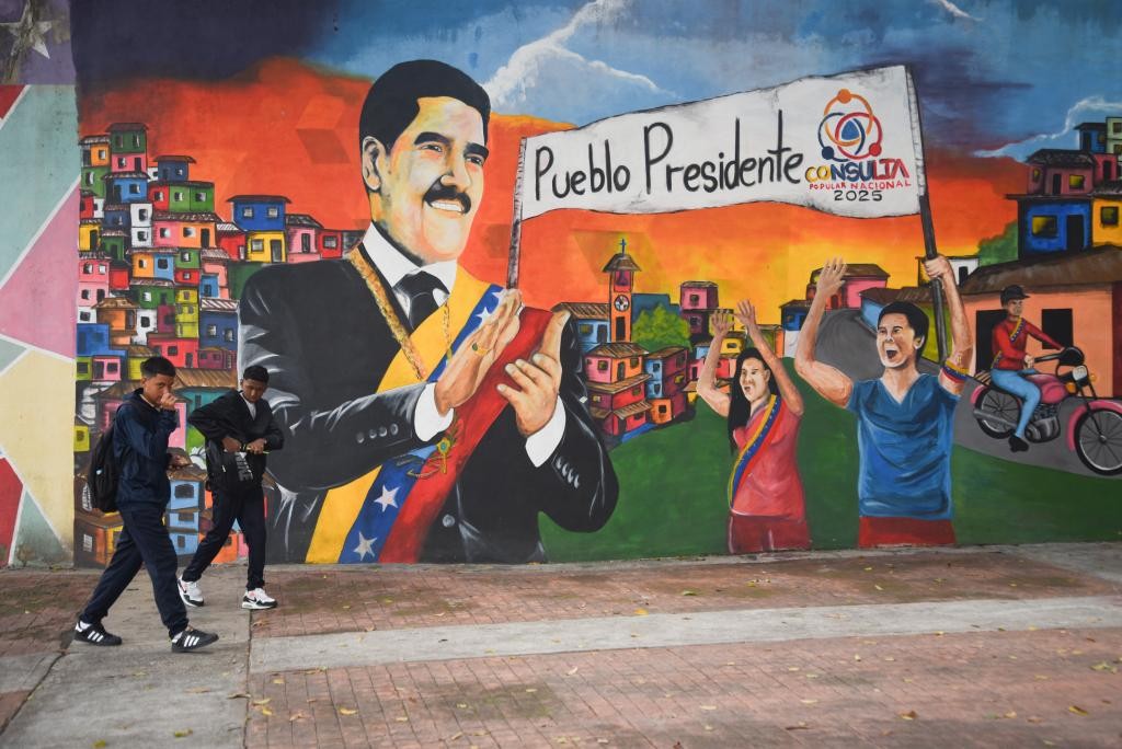 在委内瑞拉首都加拉加斯,行人从街头支持马杜罗总统的宣传标语前走过。图源:新华社