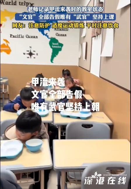 【老师记录甲流来袭的教室状态】11月29日,广东。一位老师记录了甲流来袭时的教室状态:“文官”全部告假唯有“武官”坚持上课。网友:注意防护,适度运动、锻炼,平时注意饮食。某小学的教室里,有几个学生桌子都是空着的。黑板上方鲜艳的国旗与空荡的座位形成强烈反差,粉笔灰在晨光中悬浮,消毒水的气味裹挟着此起彼伏的咳嗽声——这场突如其来的甲流疫情,让原本充满活力的教室陷入寂静。教师用手机记录下的这一幕,在社交平台引发网友关注,揭开全国校园正经历的冬季健康保卫战。"文官全倒,武官坚守。"老师在视频中这样描述。班上成绩优异但缺乏运动的学生几乎全部请假,而经常参加运动训练的"运动健将"们仍坚持上课。看到老师如此记录了甲流来袭时的教室状态,引起不少网友的共鸣,有网友表示:我儿子就属于武官类的,班上有一半的学生请假了,我儿子每天生龙活虎的,课间十分钟从不呆教室。有网友表示:和文武无关,我女儿是班里的学习委员,也不爱运动,自从甲流开始,我就没再允许孩子在学校吃早饭,并且要求她全天佩戴口罩,常常增加汤汤水水的饮食,每天早起补充蛋白质,班里两轮她就是偶尔一天嗓子不舒服,就这么过来了。还有网友表示:心腹没来,心腹大患都来了。由此可以看出甲流来袭让家长和老师都担忧不已,孩子们太受罪了,面对这种情况,无论是“文官”,还是“武官”都要注意防护,适度运动、锻炼,平时注意饮食,那么为何甲流会席卷校园?