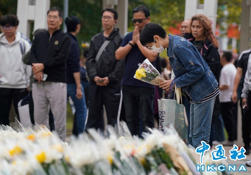 12月1日,香港大埔宏福苑五级火警第六日,不断有市民到到火灾现场附近的广福休憩处献花悼念火灾罹难者,有的祈祷、有的留言表心意。(香港中通社 陈奕启 摄) 香港中通社图片