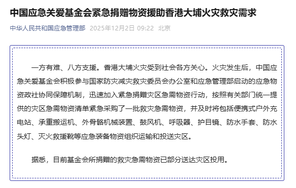 香港中通社12月2日电 香港大埔火灾受到社会各方关心。中国应急管理部12月1日表示,火灾发生后,中国应急关爱基金会积极参与国家防灾减灾救灾委员会办公室和应急管理部启动的应急物资政社协同保障机制,迅速加入紧急捐赠灾区急需物资行动。