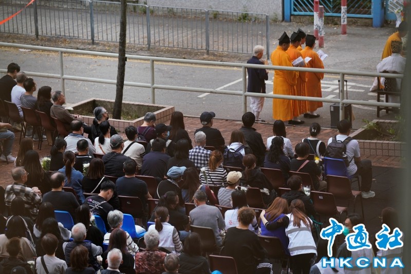 下午2时,仪式在宏福苑下面一个十字路口举行,数位佛教僧侣、道教道士相继诵经,祈愿逝者往生极乐、离苦得乐。随后,遇难者家属代表上前献花,表达哀思,不少家属情绪激动。