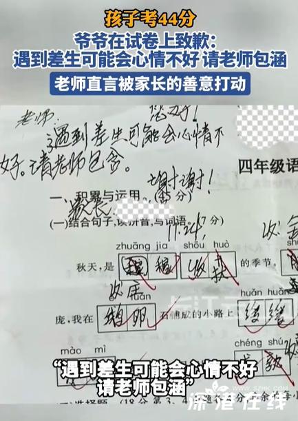 【孩子考44分爷爷请老师包涵】近日,湖北一位爷爷在孩子考了44分的试卷上对老师致歉:遇到差生可能会心情不好,请老师包涵。老师直言被家长的善意打动。任课老师表示,这只是一次小测验。孩子的父母平常都在外地打工,孩子成绩不太理想,平时也有点小调皮。但是这个留言让老师非常感动。网友热议,44分的试卷上,爷爷用最质朴的笔墨写下了一堂“共情课”。在留守儿童家庭中,祖辈被迫承担教育责任,精力和知识储备不足,他们的歉意和焦虑都藏在这简短的话语里。这份承载特殊情感的试卷属于襄阳市宜城某小学四年级学生小宇(化名)。据班主任邱老师介绍,此次测验为常规单元测试,小宇的44分在班级中处于下游水平。试卷背面那段28字的留言,是孩子爷爷在家长签字时主动写下的。"孩子父母在深圳电子厂打工,每年只有春节能回家。"邱老师透露,小宇平时由65岁的爷爷照料生活起居。老人每天清晨五点起床准备早餐,送孙子上学后再去菜市场卖菜补贴家用,傍晚接孩子回家后还要辅导作业。尽管尽心尽力,但面对四年级的语文课程,仅读过初中的爷爷常感力不从心。在批改到这份试卷时,邱老师注意到小宇的作文仅写了三行便戛然而止,阅读理解部分大量空白。但当看到试卷背面的留言时,她突然理解了那些未完成的题目背后,是一个留守家庭难以言说的困境。"爷爷的笔迹有些颤抖,'差生'两个字写得格外用力,仿佛在替孩子承担着某种压力。"邱老师在接受采访时仍难掩感动。