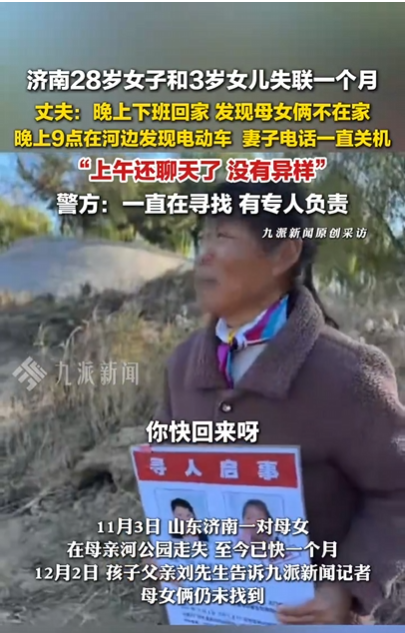 【28岁妈妈带3岁女儿失联1个月】2025年12月2日,距离山东济南的赵女士带着她3岁的女儿在黄河边的母亲河公园失联,已经过去了整整29天。丈夫刘先生每日在希望与失望之间煎熬,而一个关键的目击线索——曾有路人听到疑似小女孩呼喊“妈妈”的尖细声音——让整起事件更添扑朔迷离与无尽揪心。时间拉回11月3日,一个看似平常的日子。当天上午,刘先生还和妻子赵女士如常聊天,并未发现任何异样。下午8点03分左右,当刘先生回到家中,却发现本应在家的母女二人不见了踪影。一场焦灼的寻找随即展开。在家附近寻找一个多小时无果后,刘先生决定去离家不远的黄河边“碰碰运气”。这个决定,将他引向了事件的中心。