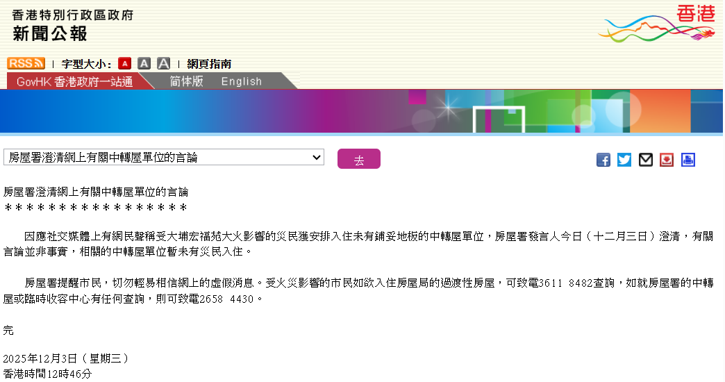 香港新闻网12月3日电 因应社交媒体上有网民声称受大埔宏福苑大火影响的灾民获安排入住未有铺妥地板的中转屋单位,香港特区政府房屋署发言人3日澄清,有关言论并非事实,相关的中转屋单位暂未有灾民入住。