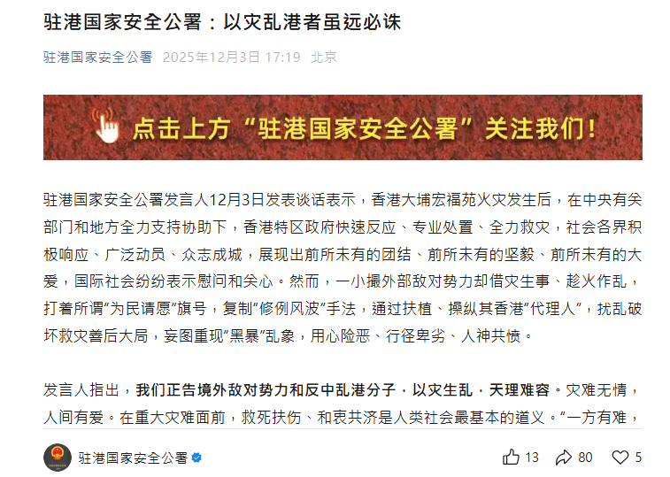 香港新闻网12月3日电 驻港国家安全公署发言人12月3日发表谈话表示,香港大埔宏福苑火灾发生后,在中央有关部门和地方全力支持协助下,香港特区政府快速反应、专业处置、全力救灾,社会各界积极响应、广泛动员、众志成城,展现出前所未有的团结、前所未有的坚毅、前所未有的大爱,国际社会纷纷表示慰问和关心。然而,一小撮外部敌对势力却借灾生事、趁火作乱,打著所谓“为民请愿”旗号,复制“修例风波”手法,通过扶植、操纵其香港“代理人”,扰乱破坏救灾善后大局,妄图重现“黑暴”乱象,用心险恶、行径卑劣、人神共愤。