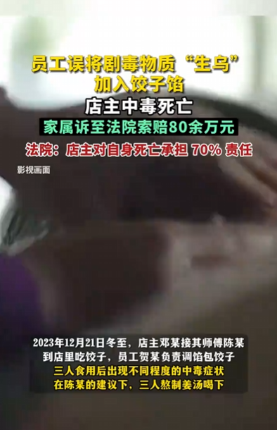 【员工误将毒药材加入饺子馅毒死老板】2023年12月21日,冬至,本该是团聚温暖的日子。在新疆乌鲁木齐一家推拿店里,员工贺某包了约200个饺子,等待老板邓某和他的师傅陈某回来共度佳节。然而,一场因疏忽引发的致命意外,让这顿饺子成了三人此生最后的午餐。悲剧的核心在于一次致命的混淆。推拿店店主邓某将有毒中药材“生乌”的粉末,与鸡精等普通调味料存放在一处。2023年冬至当天,店内技师贺某负责准备午餐饺子馅时,误将装在容器里的“生乌”粉末当成了黑胡椒粉,舀了四勺加入馅料中。“生乌”是未经炮制的生草乌,含有剧毒的乌头碱成分。据医学资料显示,乌头碱毒性极强,口服纯乌头碱0.2毫克即可中毒,3至5毫克就足以致死。贺某这看似平常的“四勺”,足以将一顿家常便饭变成致命的毒药。
