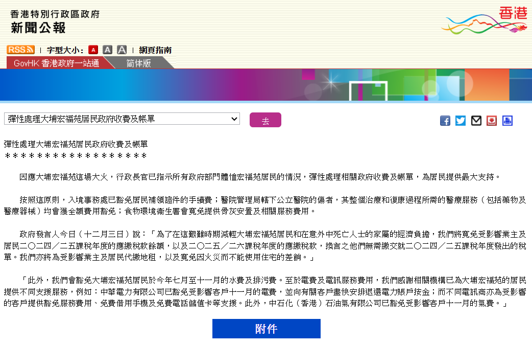 政府发言人3日表示,为了在这艰难时期减轻大埔宏福苑居民和在意外中死亡人士的家属的经济负担,我们将宽免受影响业主及居民2024/25课税年度的应缴税款余额,以及2025/26课税年度的应缴税款,换言之他们无需缴交就2024/25课税年度发出的税单。我们亦将为受影响业主及居民代缴地租,以及宽免因火灾而不能使用住宅的差饷。”