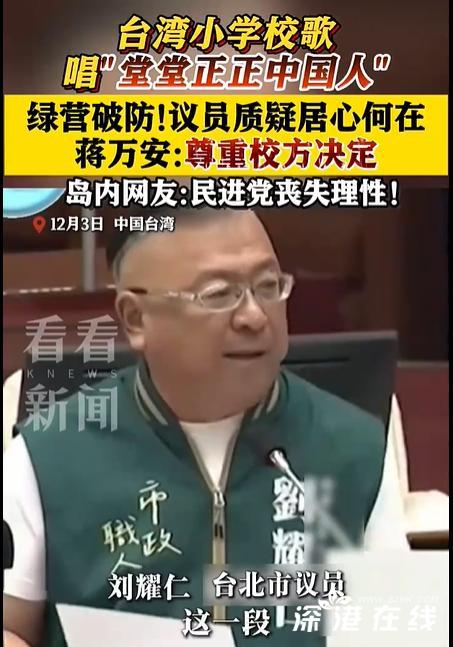 【台湾小学校歌唱中国人让绿营破防】近日,民进党籍台北市议员刘耀仁称,台北某小学在有新校歌的情况下,新校长却要学生唱回旧版、歌词仍有“堂堂正正中国人”的校歌,他强烈要求台北市政府处理。对此,台北市长蒋万安回应称:“尊重学校透过自主程序做的决定,不应对学校校歌进行政治审查。”该校新任校长上任后,决定恢复使用旧版校歌,其中"做堂堂正正的中国人"的歌词引发绿营强烈反弹。刘耀仁在台北市议会质询时情绪激动地表示:"在民主社会,学校不应强制灌输特定政治意识。"他援引该校2022年通过民主程序制定的新校歌,指控此举违背"教育去政治化"原则,要求台北市政府立即干预。面对质询,台北市长蒋万安以"尊重学校自主程序"为由拒绝介入,强调"教育应回归专业决策,不应进行政治审查"。这一回应引发绿营更大不满,民进党发言人陈培瑜指责蒋万安"纵容威权复辟",称此举将"让校园成为统战战场"。