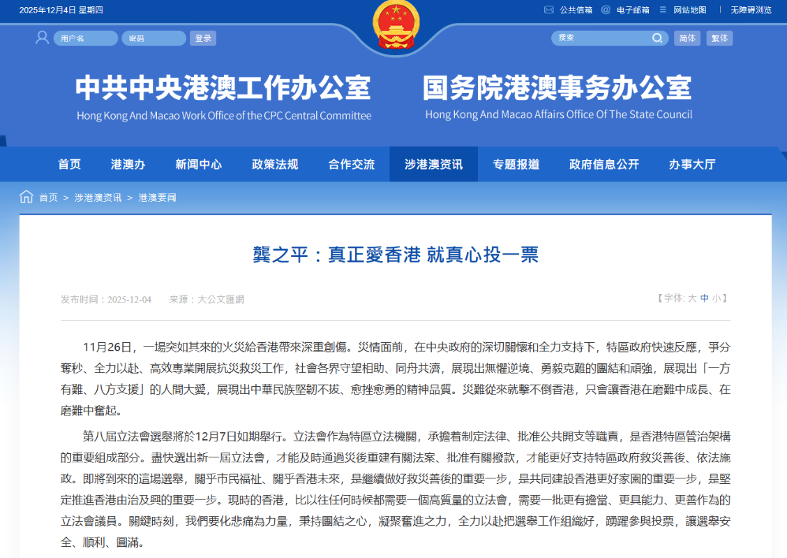 香港新闻网12月4日电 中共中央港澳工作办公室、国务院港澳事务办公室网站4日转发题为《龚之平:真正爱香港 就真心投一票》的港媒文章,全文如下: