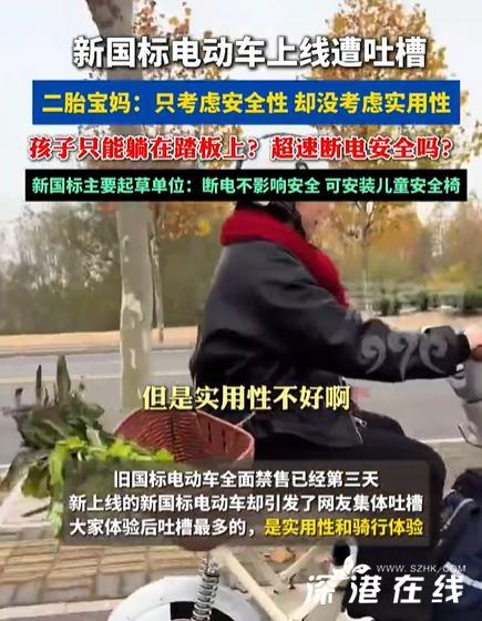 【二胎宝妈:新国标电动车实用性不好】12月3日,杭州多家电动车专卖店调研显示,新国标电动车因取消后座、缺乏储物空间遭二胎宝妈集体吐槽,部分车型价格较旧款上涨近700元,车主反映接送儿童不方便。旧国标电动车全面禁售已经第三天,新上线的新国标电动车却引发了网友的集体吐槽,大家体验后吐槽最多的是实用性和骑行体验。有网友表示,新车虽然更安全了,但车上连个放头盔和充电器的地方都没有。对这些用户来说车上的储物空间和后座都是必需品,但目前市面上的新车都没有这些功能。大家关注的“超速即断电”的问题,新国标主要起草单位中国电子技术标准化研究院表示,不会导致急刹车,不会影响交通安全。同时,新标准也充分考虑了搭载儿童的使用场景,有此种需求的消费者可通过在后座等位置安装儿童安全椅的方式解决。