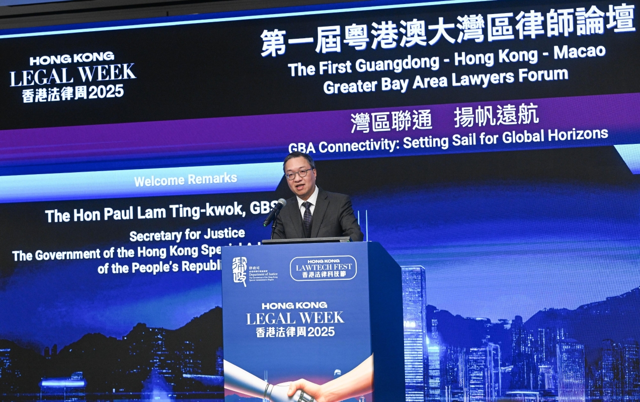 律政司司长林定国资深大律师五日在香港法律周2025—第一届粤港澳大湾区律师论坛上致开幕辞。图源:政府新闻处