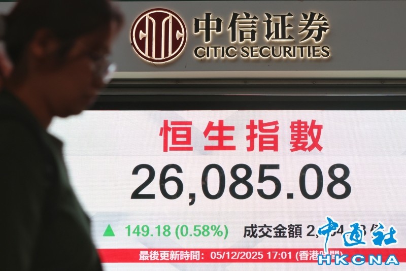 香港中通社12月5日电(记者谭畅)港股5日升149点或0.58%,恒生指数当日收报26085点。大市全日成交额约为2104.7亿港元。总结全周,恒指累升226点或0.87%,连续两周上升。
