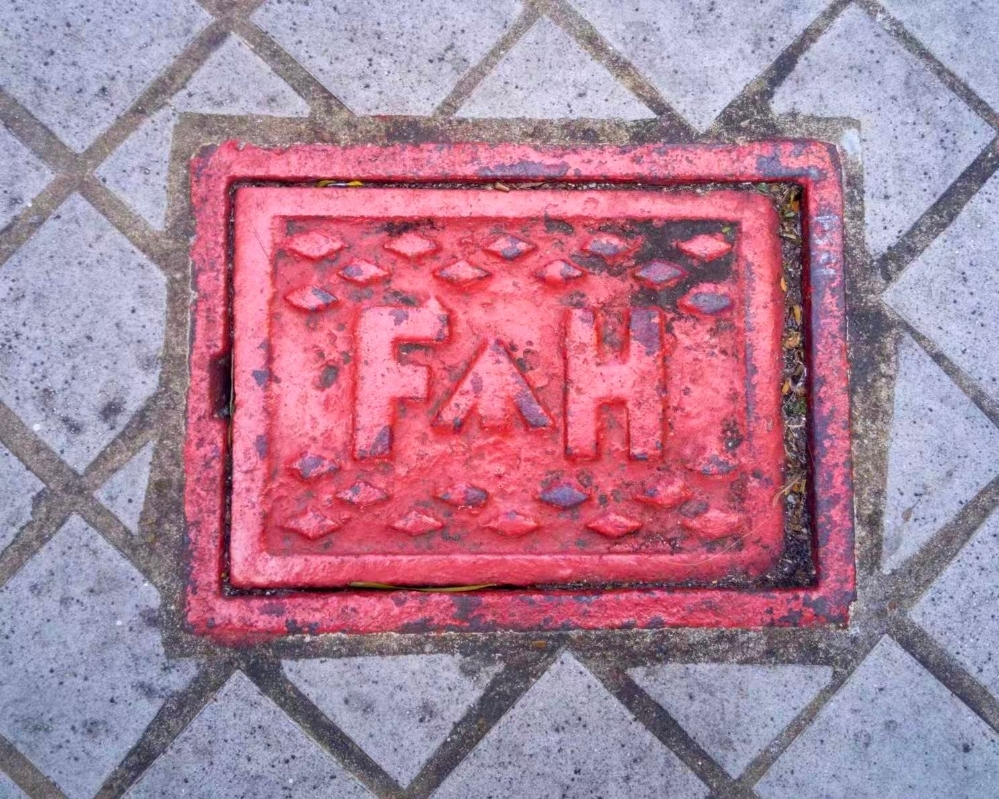标有“F↑H”字样的消防栓盖,红色盖代表淡水。(香港中通社记者 黄璇摄)