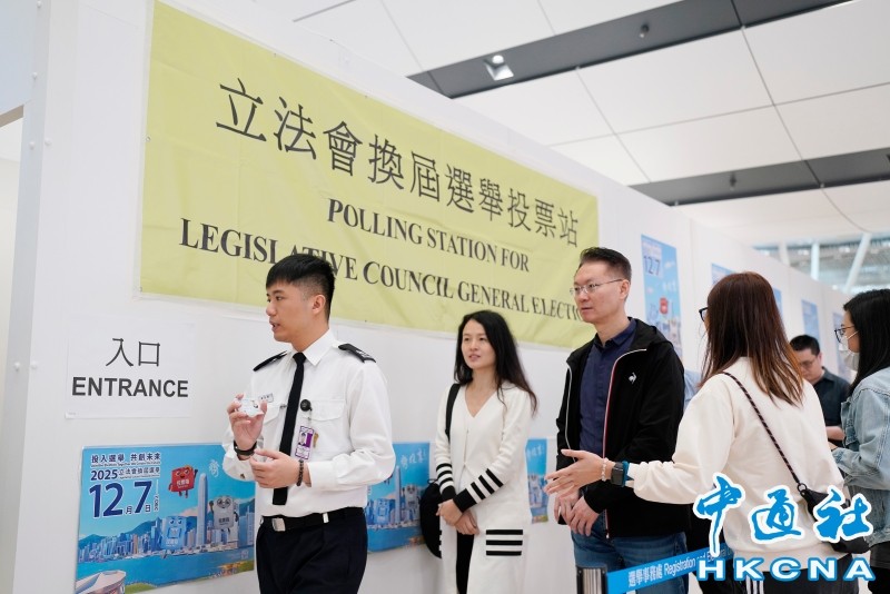 市民前往设于香港国际机场二号客运大楼旅游车候车大堂的邻近边境投票站投票(陈奕启 摄)