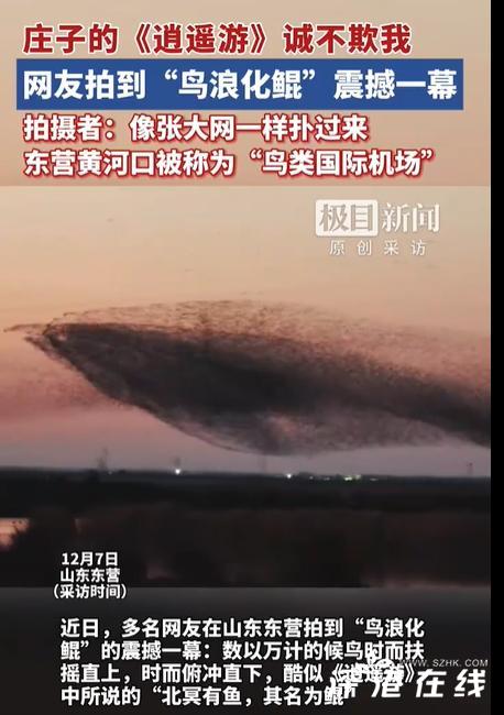 【东营黄河口“鸟浪化鲲”太震撼】近日,多名网友在山东东营拍到“鸟浪化鲲”的震撼一幕:数以万计的候鸟密密麻麻地在天空翱翔,时而扶摇直上,时而俯冲直下,队形不断地变化,酷似《逍遥游》中所说的”北冥有鱼,其名为鲲。“壮观的场面让无数网友感叹,并在评论区留言道:”古人诚不欺我,上古传说中的鲲鹏竟然是真的!“据悉,山东东营黄河三角洲是候鸟迁徙路上重要驿站,被誉为”鸟类国际机场“。每年冬天,大批游客前来拍照打卡。数以万计的候鸟从芦苇荡中腾空而起,时而聚合成巨鲸般的黑色漩涡,时而幻化为鲲鹏展翅的金色流光,在晨光中划出令人屏息的轨迹。这场被网友称为“鸟浪化鲲”的生态奇观,不仅让《逍遥游》中“北冥有鱼,其名为鲲”的想象具象化,更成为全球生物多样性保护的鲜活注脚。“最初看到远处飘来一团黑雾时,我以为是暴风雨前的积雨云。”游客举起手机的手微微颤抖,镜头里,鸟群正以每秒数米的速度逼近。当这群“空中巨鲸”掠过头顶时,他清晰地听见羽翼切割空气的呼啸声,如同远古战鼓的轰鸣。据山东黄河三角洲国家级自然保护区监测,今年冬季迁徙季的“鸟浪”规模创下历史纪录:仅花脸鸭单一物种集群就超过24万只,较去年同期增长41%。正高级工程师单凯指着监控屏幕解释:“这些候鸟正通过群体飞行降低被捕食风险,同时利用空气动力学原理节省体能。”屏幕上,鸟群时而形成螺旋上升的“龙卷风”,时而展开扇形扩散的“孔雀屏”,其精密程度堪比现代飞行编队。这片曾被称作“中国最年轻湿地”的土地,如今已成为全球候鸟迁徙路线上的“国际机场”。联合国教科文组织东亚地区办事处主任夏泽翰在11月的国际观鸟季活动中惊叹:“黄河三角洲的生态恢复速度,堪称世界自然保护史上的奇迹。”
