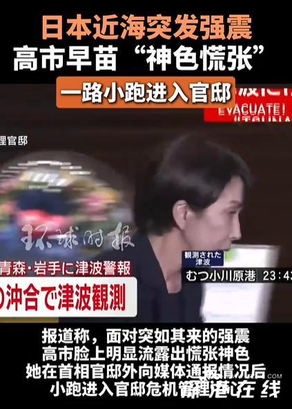 【日本强震 高市早苗神色慌张一路小跑】当地时间8日23时15分左右,日本青森县东部海域发生7.5级地震。日本首相高市早苗立即前往首相官邸,并在途中与记者短暂会面,时长约1分钟。报道称,面对突如其来的强震,高市脸上明显流露出慌张神色。她在首相官邸外向媒体通报情况后,小跑进入官邸危机管理中心。之后高市早苗对此再次发声,目前报告显示有30人在地震中受伤,1处住宅发生火灾。这次地震后,北海道到三陆近海一带发生大规模地震的可能性比平常更高。是否真的会发生大规模地震尚不确定,大家必须充分理解这一点,并基于“自己的生命由自己守护”的原则采取防灾行动。这场地震的破坏力不容小觑。日本气象厅紧急发布海啸警报,多地观测到海啸。更令人神经紧绷的是,位于震区附近的核废料处理厂确认有超过100升的池水因震动溢出,福岛第一核电站的核污染水排海作业也因海啸预警而紧急暂停。截至当地时间9日上午9时,相关海域已发生余震15次。高市早苗的"小跑"与"慌张",之所以被镜头放大,是因为外界从中读出了超越灾害应急的别样信号。这位以强硬著称的首相,在面对自然灾害时展现出的仓促与不安,与其平日塑造的政治形象形成鲜明对比。她在官邸外向媒体通报情况后,一路小跑进入对策室的画面,成为这场危机中最具传播力的政治符号。高市早苗在危机时刻呼吁国民"自己的生命自己守护",这句话本是日本防灾教育的核心要义。但当它从一位面露慌张的首相口中说出时,语境发生了微妙变化。国民可以且应当自救,但前提是他们对国家的整体应急系统抱有基本信任。领导人的瞬时反应,恰恰是这种信任感的"温度计"和"放大器"。