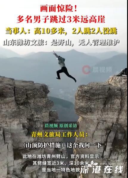 【多名男子在野山上跳过近3米远高崖】12月7日,山东潍坊青州劈山,一段男子跨越近3米宽悬崖裂缝的视频在网络疯传。画面中,一名男子助跑后纵身跃过深达十余米的垂直峭壁,身后同伴举着手机拍摄,对面山崖上还有人等待接应。这场被网友称为“跳劈山”的极限挑战,将野山探险的安全隐患与流量狂欢的荒诞逻辑推至舆论风口。青州劈山因主峰断裂如刀劈斧砍得名,其山顶裂缝宽约2.7至3米,两侧峭壁近乎垂直,深度超过10米。这座未经开发的“网红野山”,近年来吸引众多探险者前来打卡。12月7日,四名男子专程驱车前来,其中两人成功完成跳跃,另外两人因“不好跳”放弃尝试。视频发布者坦言:“我们就是来挑战的,跳过去的人觉得自己很厉害。”这种危险行为并非孤例。梳理发现,近三年劈山至少发生12起类似跳跃事件,多名博主在短视频平台发布跨越裂缝的“炫技”视频。2025年11月,某登山博主虽在评论区提醒“裂缝附近凹凸不平,最好别跳”,但其视频仍获得超50万点赞。更令人揪心的是,现场照片显示,裂缝边缘仅容一人站立,下方是裸露的岩石,稍有不慎就会坠落。面对舆论质疑,青州市云门山街道办工作人员承认:“劈山属于未开发区域,没有专人管护。”青州文旅局则表示:“该地不算景区,不清楚是否有安全设施,将派人了解处理。”这种“野山属性”成为监管盲区的挡箭牌——既无需承担景区安全责任,又可享受网红景点带来的流量红利。