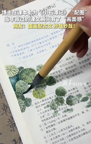 【当年背过的《小石潭记》有了画面感】12月12日消息,博主在课本上为《小石潭记》“作画”,当年背过的课文瞬间有了画面感。据视频显示,这名颇具巧思的博主在泛黄书页间展开了一场跨越千年的艺术对话——当指尖的毛笔轻触《小石潭记》的墨香文字,原本沉寂的文言文瞬间被赋予了呼吸。他以水墨为媒,在课文旁晕染出石潭中亭亭如盖的荷叶,笔锋游走间,或圆润如盘、或舒展似伞的叶片便跃然纸上;转而勾勒"为坻为屿为嵯为岩"的怪石,时而如利剑刺破水面,时而似卧牛静伏潭底,时而若孤峰独立,时而像群屿相偎,将柳宗元笔下千姿百态的石头形态演绎得淋漓尽致。