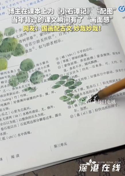 【当年背过的《小石潭记》有了画面感】一支细毫毛笔在语文课本的空白处游走,墨色由浓转淡,荷叶田田,鱼影翩跹,柳宗元笔下那个“凄神寒骨”的幽僻世界,瞬间破纸而出。近日,一位博主在社交媒体上分享了自己为语文课本中的《小石潭记》绘制的国画插图。视频里,随着毛笔在纸张上自如地来回穿梭,课文旁先是出现了一片漂着荷叶、游着红鲤的池塘,接着一条竹林石径蜿蜒通向远山。这幅“跃然纸上”的画作,让无数网友惊叹“国画配古文,妙哉妙哉!” 这场跨越千年的“书画合璧”,不仅复活了一篇经典课文,更点燃了公众对传统文化在当代如何生动传承的广泛共鸣。视频中,创作过程本身就如同一场精心编排的仪式。博主并非在画布上,而是直接于课本的留白处施墨。笔尖首先勾勒出舒展如伞的荷叶,随即,文中“皆若空游无所依”的鱼群,化为数尾灵动的墨影,仿佛悬于清澈的虚空。接着,画笔转向“为坻,为屿,为嵁,为岩”的岸边奇石,墨色皴擦间,石头的嶙峋质感顿生。最后,以疏淡的笔法扫出“竹树环合”的远景,清幽冷寂的意境全出。这并非简单的图文搭配。当游鱼以“空游”之态浮现时,时空的壁垒被瞬间击穿。网友感慨,那个一千二百多年前柳宗元“伐竹取道”的清晨,突然被赋予了色彩与形状。