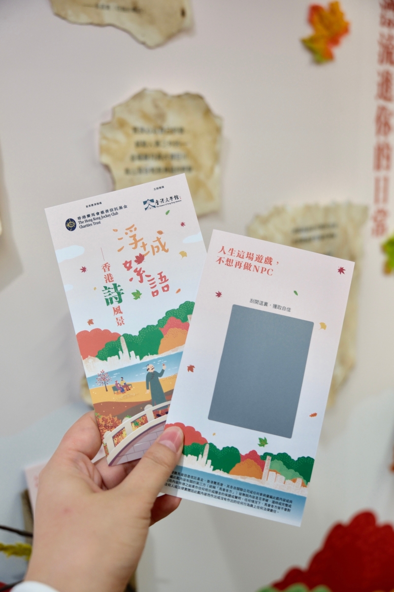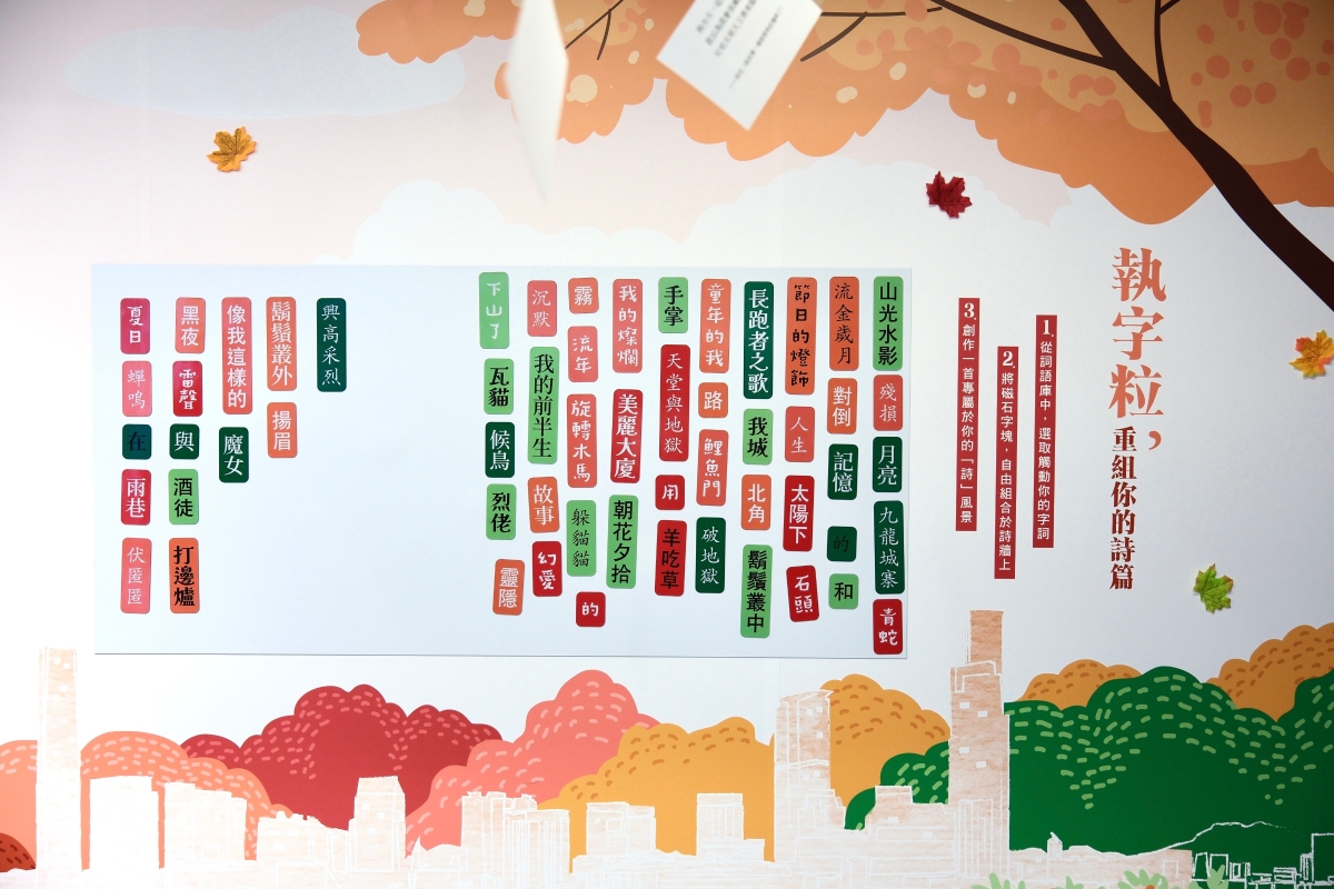 为提升公众的参与感与展览的趣味性,现场设有多项体验活动。“浮城诗意刮刮卡”提供五款不同主题选择,每张卡片均隐藏香港本土诗人的作品,让公众可以随心情与喜好,邂逅命中注定的诗句。展览亦鼓励公众亲身参与诗歌创作,体验诗人玩转文字的乐趣。“执字粒,重组出你的诗篇”互动板,以香港文学作品书名为基础设置词语库,公众可挑选字词于磁吸墙上自由拼贴,无需拘泥格律,尽情发挥创意,创作独具个人风格的诗篇。