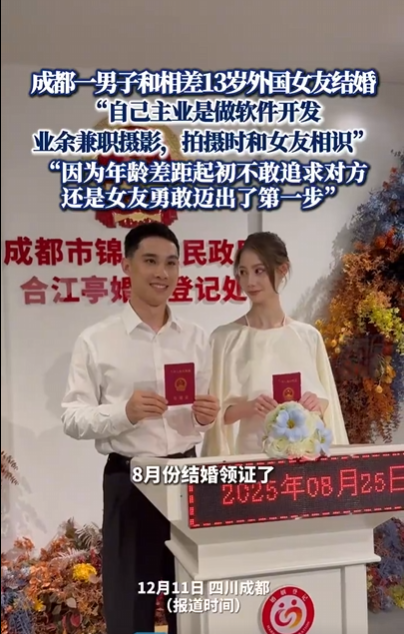 【成都一男子和相差13岁外国女友结婚】成都的一位软件工程师在摄影兼职中邂逅了比自己小13岁的外国模特。他起初因不敢追求而犹豫,但最终是女方勇敢迈出了第一步。33岁的杜先生主业是软件开发,业余兼职摄影。在一次拍摄中,他结识了从国外来中国从事模特工作的女友。杜先生坦言,面对13岁的年龄差,自己起初不敢追求对方,觉得有些自卑,是女友的勇气打破了僵局,主动迈出了第一步,才促成了这段跨国恋情。