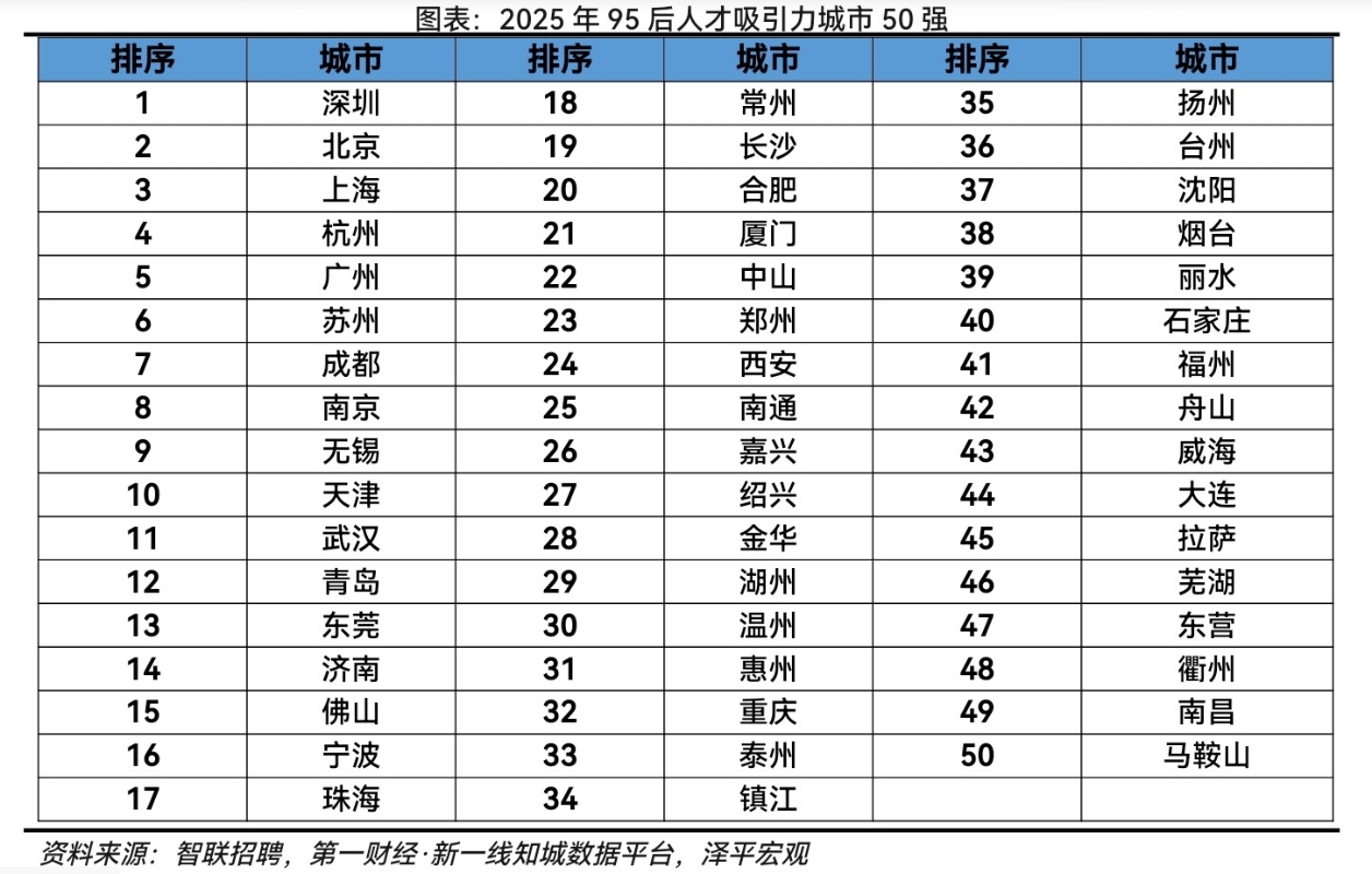 智联招聘联合泽平宏观日前联合发布《中国城市95后人才吸引力排名:2025》。数据显示,凭借突出的创新产业结构和人才友好型的城市环境,深圳已连续三年位居该榜单榜首。与此同时,广东省内多城在榜单中都有亮眼表现,全省共有7座城市跻身95后人才吸引力50强,珠三角城市群对95后人才的集聚效应显著高于全国平均水平。