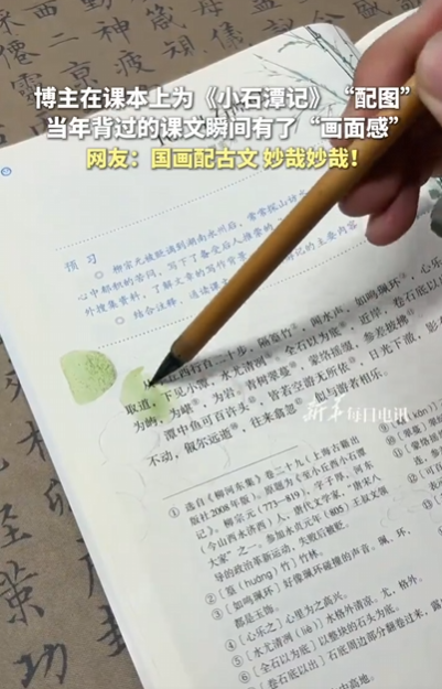 【当年背过的《小石潭记》有了画面感】2025年12月12日,社交媒体被一股清新的文化暖流席卷。一位博主发布的手绘视频意外走红:他用传统国画技法,在语文课本《小石潭记》文字的空白处,勾勒出一幅水墨长卷。石潭、游鱼、青荷、竹影仿佛从柳宗元的句读间生长出来,与文言文并肩而立。网友惊叹:“国画配古文,妙哉妙哉!”当年死记硬背的课文,突然有了呼吸和温度。