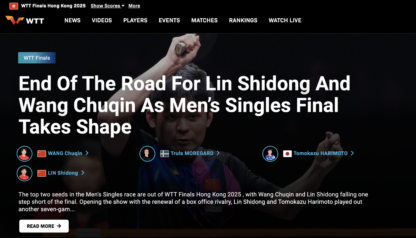 香港新闻网12月14日电 2025年世界乒乓球职业大联盟(WTT)香港总决赛14日下午举行两场男单半决赛,中国选手王楚钦和林诗栋均无缘决赛。