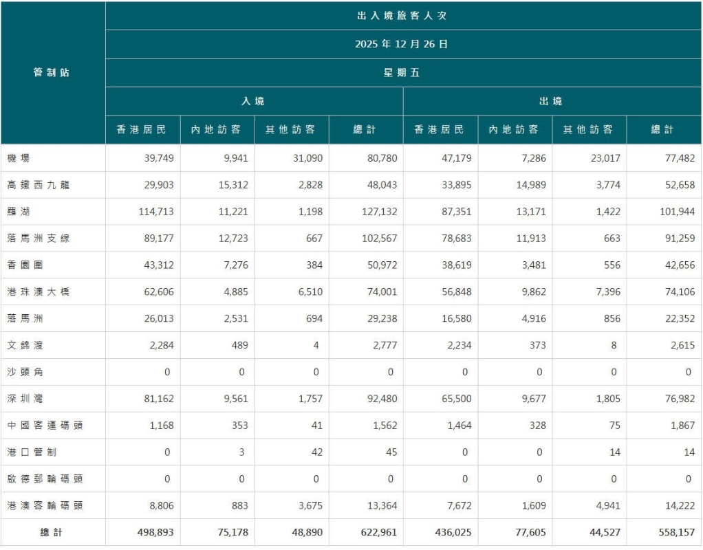 昨日(12月26日)是圣诞节小长假的第二天,继续有不少香港巿民外游。香港特区政府入境处最新数字显示,截至12月26日晚24时约有118.1万人次出入境,较2024年同时段的94.6万为多,当中近55.8万人次出境,较2024年同时段的42.4万人次大增13万人,而至12月26日晚24时则有62.2万人次入境,与2024年同时段的52.2万人次比较也大增了10万人。