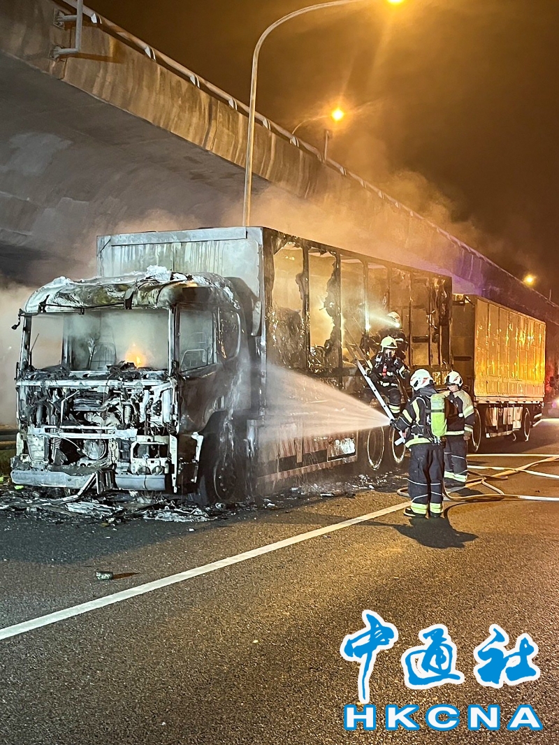 1月6日清晨台湾第一号高速公路林口路段发生火烧车意外。一辆满载食品的联结车行经高速公路1号北向43.7公里时,司机听见引擎有异音,将车停至路肩下车查看,车辆随即起火烧成废铁。