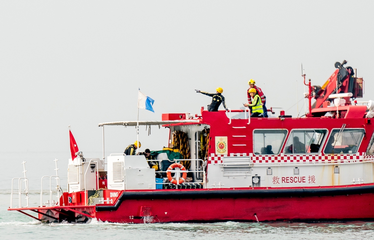 消防支援艇救起第三名堕海生还者,并移送上消防船。