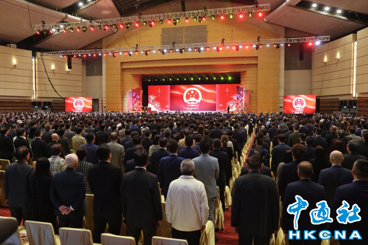 2月4日,中央政府驻港联络办2026年新春团拜会在香港会议展览中心举行。 图为团拜会开始前,全体嘉宾奏唱国歌。 (香港中通社记者 谢光磊 摄) 香港中通社图片