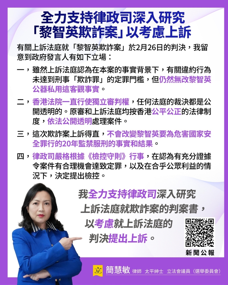 简慧敏表示,全力支持律政司深入研究上诉法庭就欺诈案的判案书,以考虑就上诉法庭的判决提出上诉。(完)