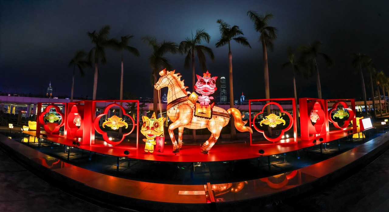 康乐及文化事务署在香港文化中心露天广场举办“丙午年春节彩灯展”,每晚6时亮灯,免费让公众欣赏融合香港非物质文化遗产元素的璀璨彩灯,有不少“骏马”、醒狮、金钱、大吉元素,充满气氛。