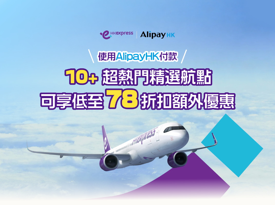 由2026年3月4日早上10时至3月8日晚上11时45分期间,用户只需于AlipayHK手机应用程式主页的活动Banner,或直接搜索“HK Express”/“香港快运”,即可领取专属优惠码及限量礼券,再经HK Express官方网站或手机应用程式预订从香港出发的精选航点来回机票(包括多城市行程),结账时输入优惠码并选用AlipayHK付款,即可享低至78折机票优惠。(完)