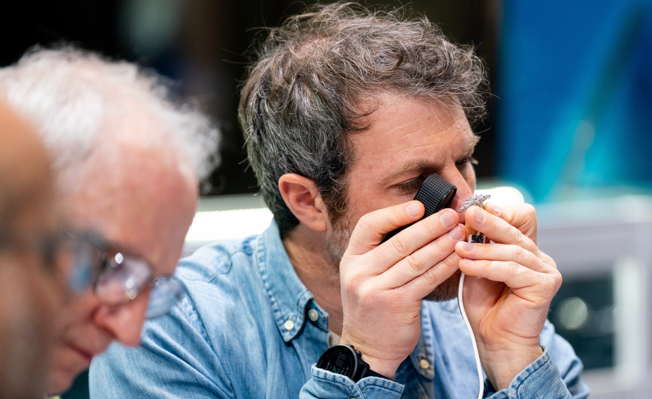 珠宝展位买手在鉴定珠宝。