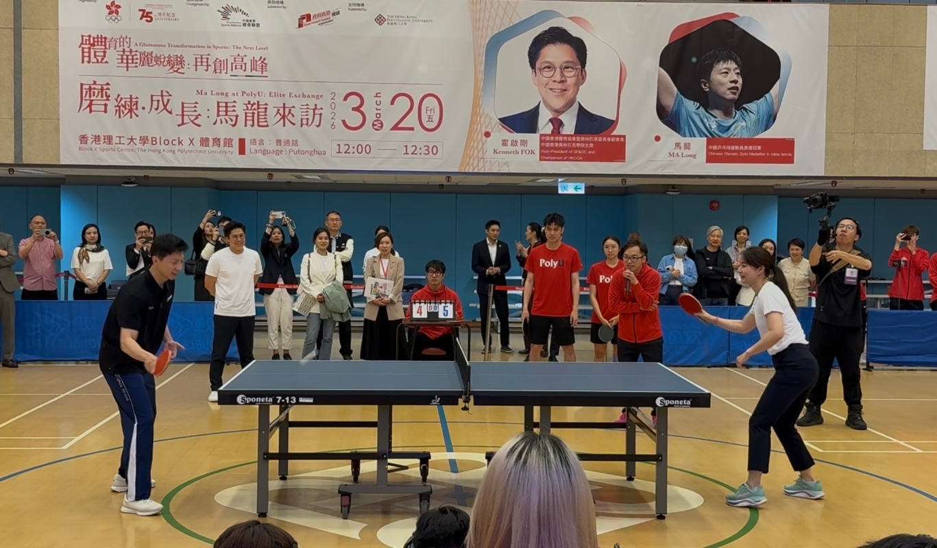香港新闻网3月20日电(记者 谭畅) 中国国家队乒乓球运动员、六面奥运金牌得主马龙20日现身香港理工大学赛马会综艺馆,瞬间引爆全场!马龙更与郭晶晶、霍启刚梦幻联动,分别切磋球技。