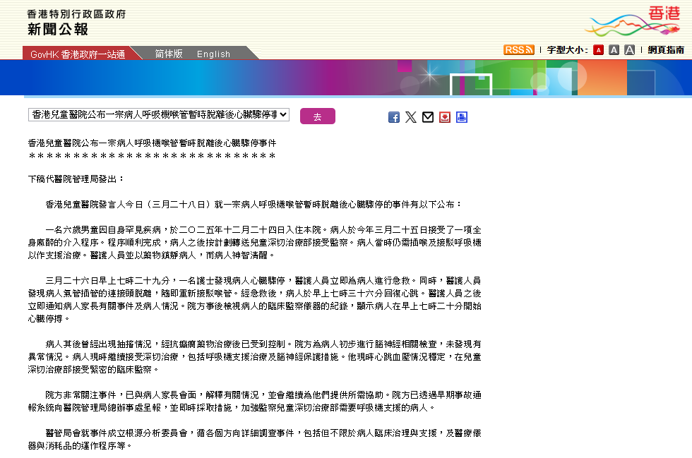 香港新闻网3月28日电 香港儿童医院28日公布一宗病人呼吸机喉管暂时脱离后心脏骤停的事件。