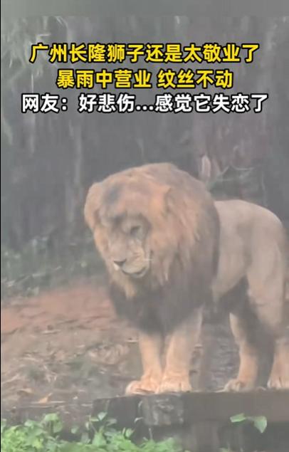【广州狮子暴雨中纹丝不动“营业”】2026年3月29日,广州长隆野生动物世界,一场暴雨毫无征兆地倾盆而下。游客们撑起雨伞、裹紧雨衣,匆匆寻找避雨处。然而,就在狮子山的台阶高处,一头雄狮安静地站着,低着头,任大雨劈头盖脸浇下来,鬃毛湿透贴在身上,它却纹丝不动,一步也没有挪。这一幕被冒雨游园的女子拍下。视频里,暴雨如注,其他动物或许早已躲进洞穴,唯独这头狮子像被按下了暂停键。女子将视频配上伤感的背景音乐发到网上,很快引发热议。她形容狮子站在那里的模样,“像极了失恋——不是那种愤怒的失恋,是那种沉默的、发呆的、连雨都懒得躲的失恋”。