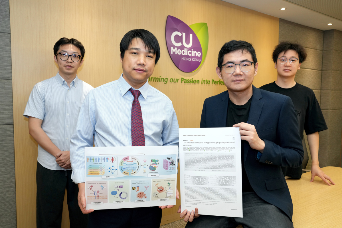 团队利用“相似性网络融合”方法,分析152名ESCC患者多组学数据的特征相似程度,包括全基因排序、RNA测序及DNA甲基化测试等;并对照现时不同文献就ESCC的八种主流分型系统,从而鉴定出四种共识分子亚型(ECMS 1-4)。每种分型各具独特生物学特征及治疗意义,成为全球首个统一并具有高度共识的ESCC分型系统。