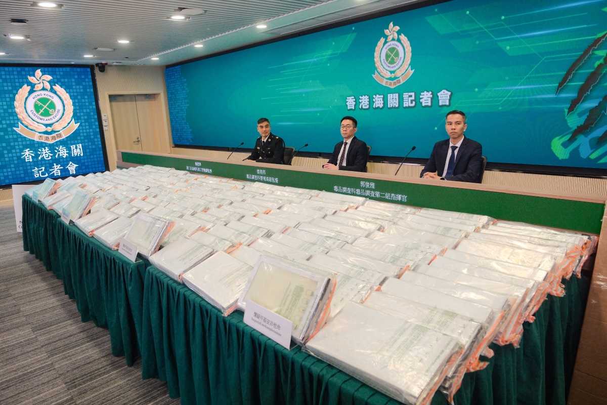 香港新闻网3月5日电(记者 许其皓)3月5日,香港海关召开记者会通报,香港海关2月10日在葵涌侦破一宗贩运毒品案件,检获约680公斤怀疑冰毒,估计市值约3亿6000万元。经跟进调查后,海关人员拘捕3名怀疑涉案男子。海关毒品调查科署理高级监督曾建邦、海关港口及海域科港口管制课监督赖恩宁及海关毒品调查科毒品调查第二组指挥官郭俊雅讲述案情。
