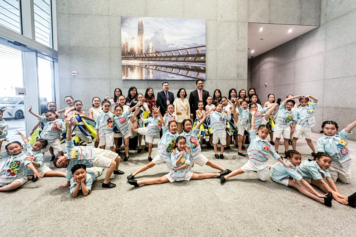 民政及青年事务局局长麦美娟(后排右二)、民政及青年事务局副局长梁宏正(后排右一)等人与表演者合影